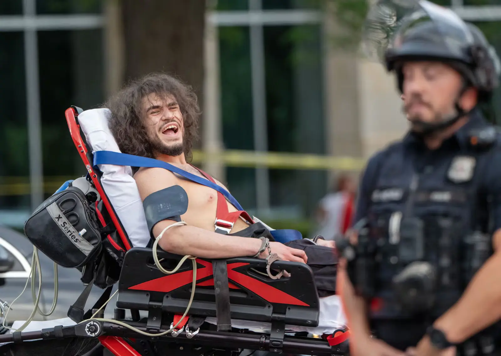 Arturo Gamboa, 24, is taken away in handcuffs on a gurney and yells that he was shot during the “No Kings” protest and march in Salt Lake City on Saturday. A 39-year-old man died Saturday after being shot during the protest, police said. Scott G Winterton, Deseret News