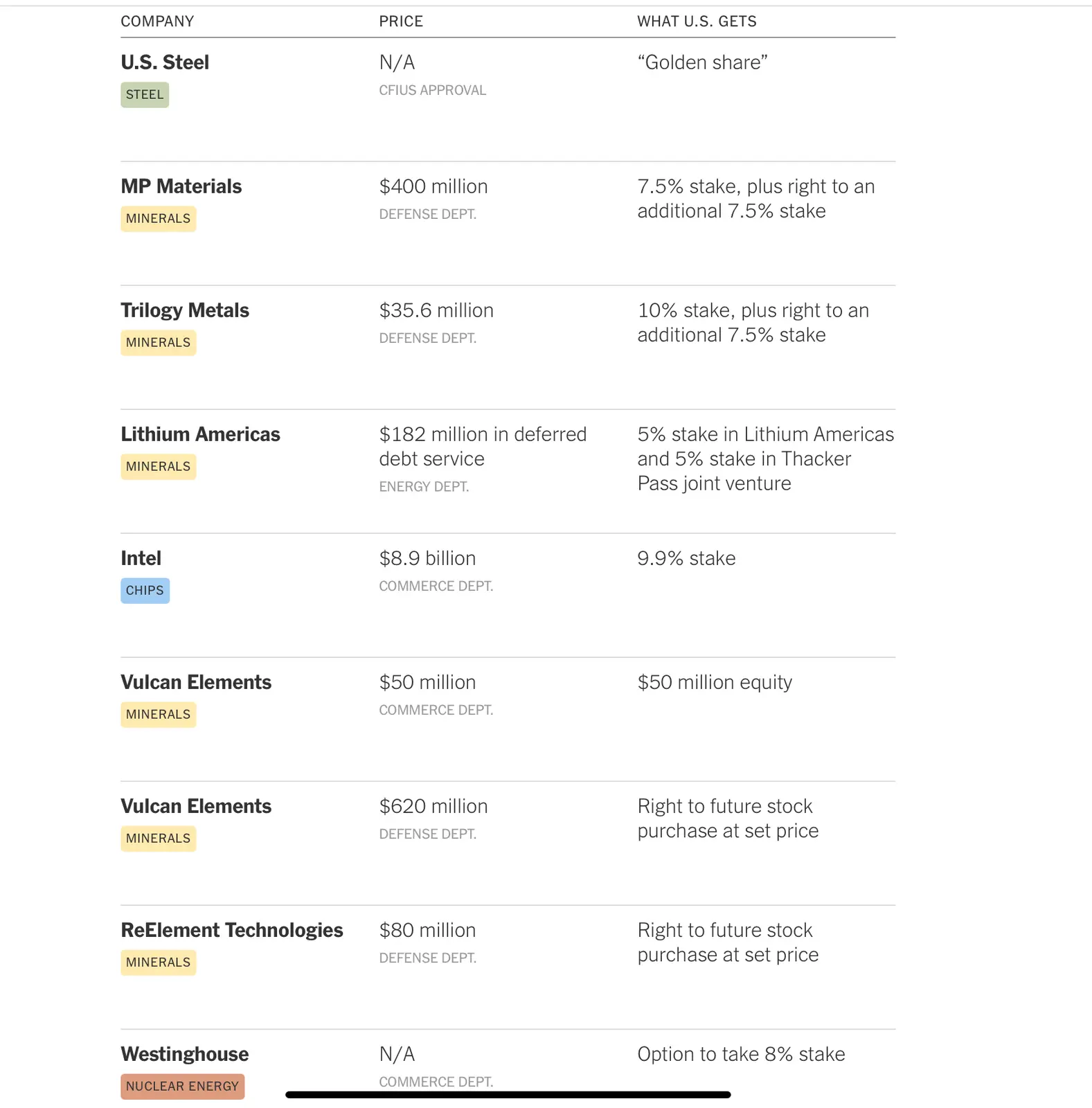The government’s growing portfolio of corporate ownership involves minority stakes, or the option to take them in the future, in at least nine companies involved in steel, minerals, nuclear energy and semiconductors, a New York Times analysis found. The deals were all struck in the past six months, with the bulk made in October and November.