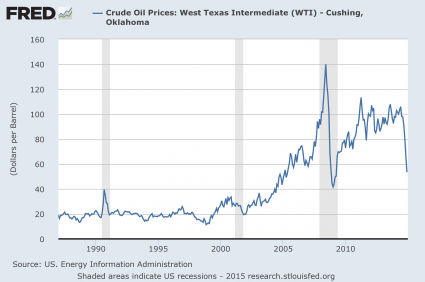 #4 The price of oil crashes. As I write this, the price of U.S. oil has dipped below $48 a barrel. But back in June, it was sitting at $106 at one point. As the chart below demonstrates, there is only one other time in history when the price of oil has declined by more than $50 in less than a year…