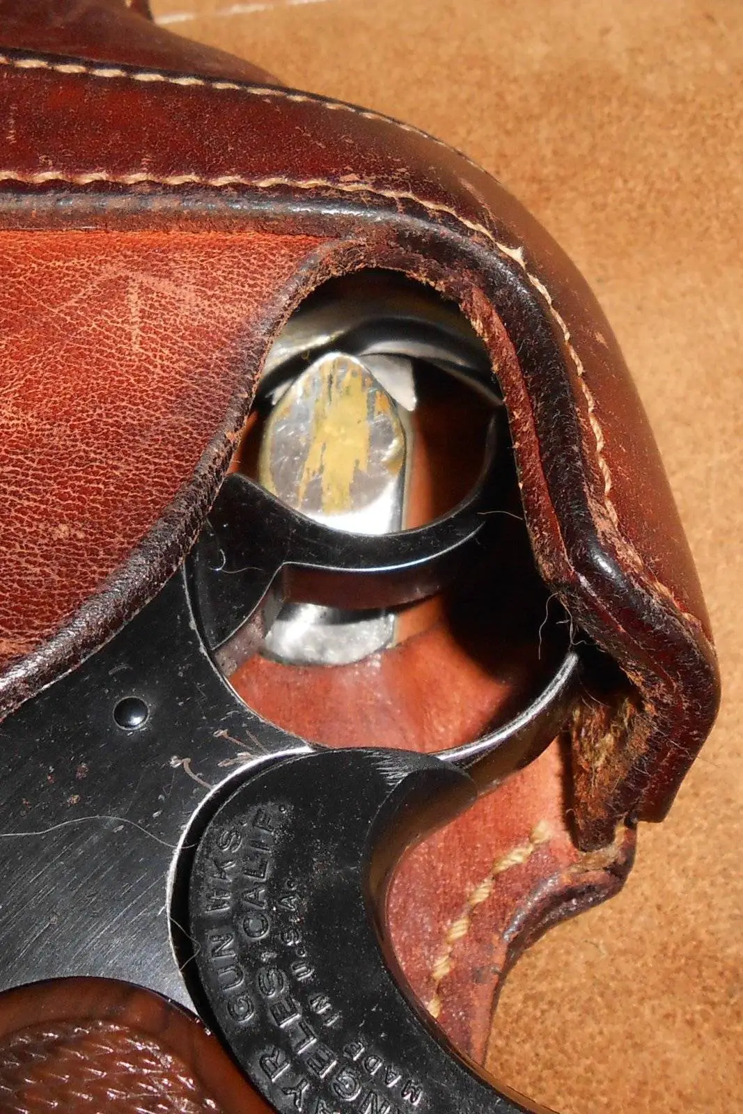 A spring-loaded brass clip snaps into the inside of the trigger guard and secures the revolver. You simply press the clip down and remove the revolver.
