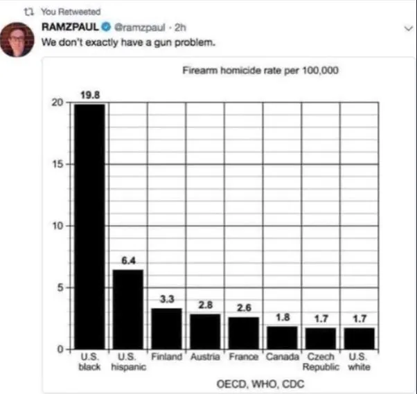 Then show me the statistics that the Black on Black and Black on White homicide rate is anywhere near, in low-income conservative rural areas.