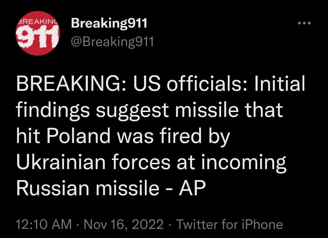 Now Poland and NATO says likely Ukrainian munition attempting to shoot down Russian rocket and not longer saying 2, but only talking about 1. Beats me, but if that's what Poland says, I'd go with it.The United States assesses that Russia is suffering failure rates as high as 60% for some of the precision-guided missiles it is using to attack Ukraine. I think that when the Russians fire 100 missiles, one of two of them going way off target is not that unusually.