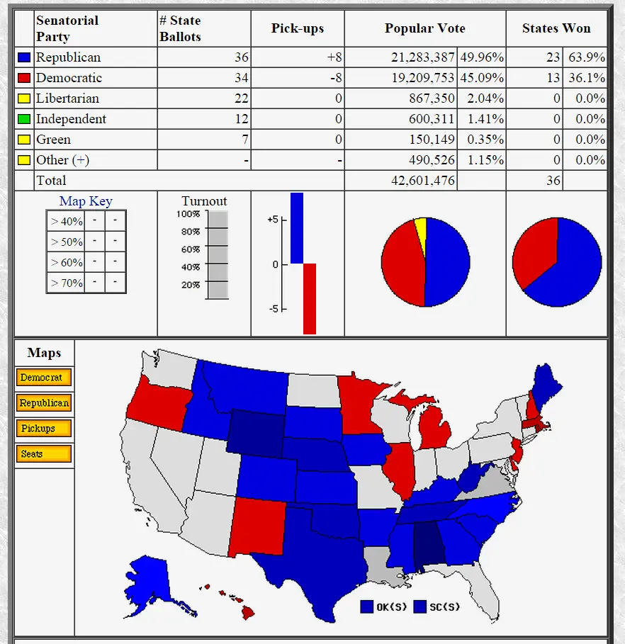 The preliminary totals for the 36 senatorial races in 34 states are coming through at uselectionatlas (dot) org.