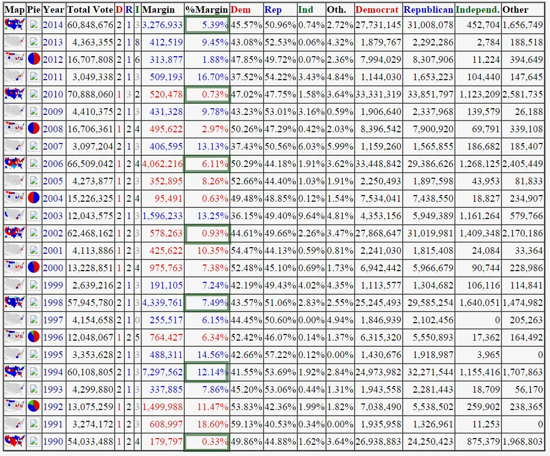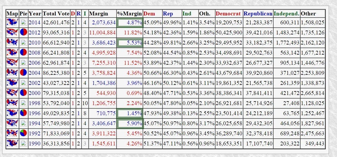 Here's a comparative table to former Senatorials. I have made a green-box to show the GOP winning margins since the 1990s:
