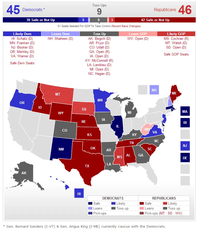 And then there is Angus King (I - ME), who, should the GOP only win 5 seats for some reason, could play kingmaker and decide to caucus with the GOP. So, in reality, the GOP only needs to win 5 seats, but 6-8 are very likely.