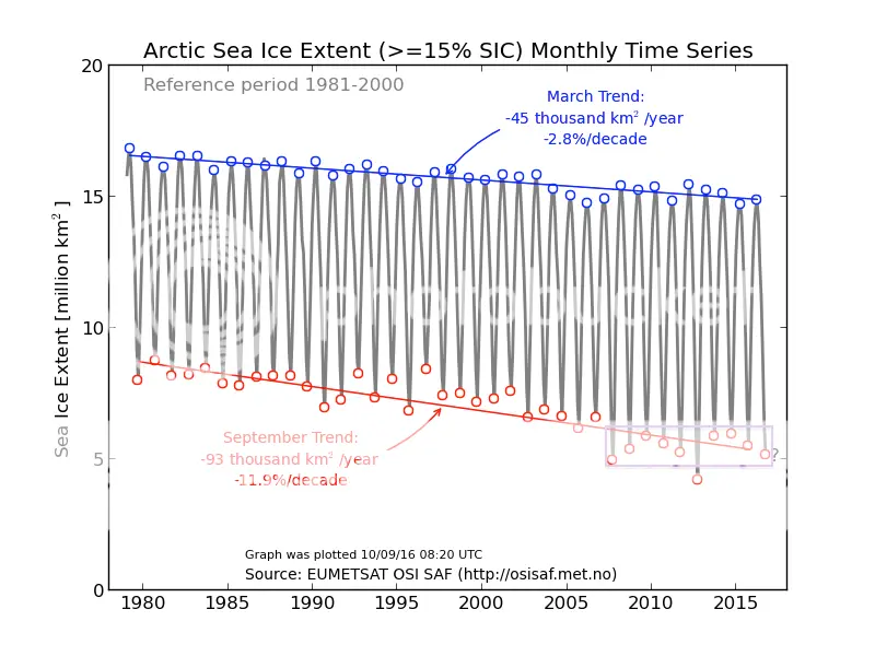 In the late 2000s, experts and climate bedwetters, like Al Gore – warned the late summer Arctic sea ice would disappear already by 2015.