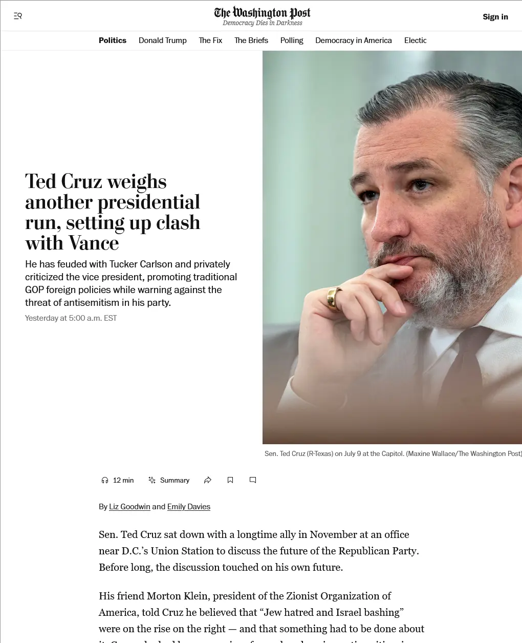 I doubt Cruz will run.IDK. The republican primary process will be in play and while Vance will have a definite incumbent advantage, it doesn't always work to their advantage--Hubert Humphrey. I think the front runners will include Rubio and Cruz and possibly DeSantis. It will be interesting--any one of the four is preferable to ANYONE the democrats have in the wings.