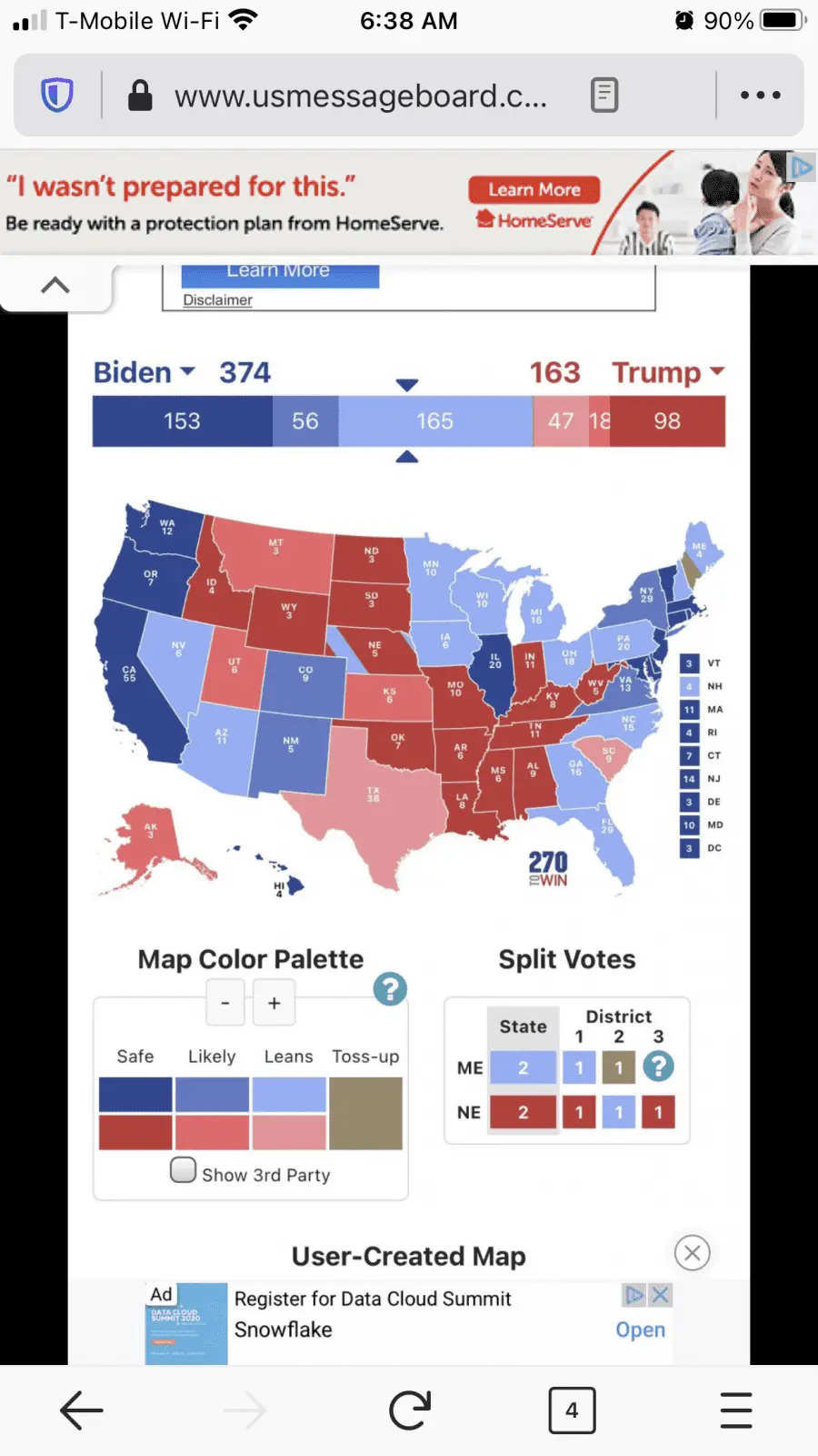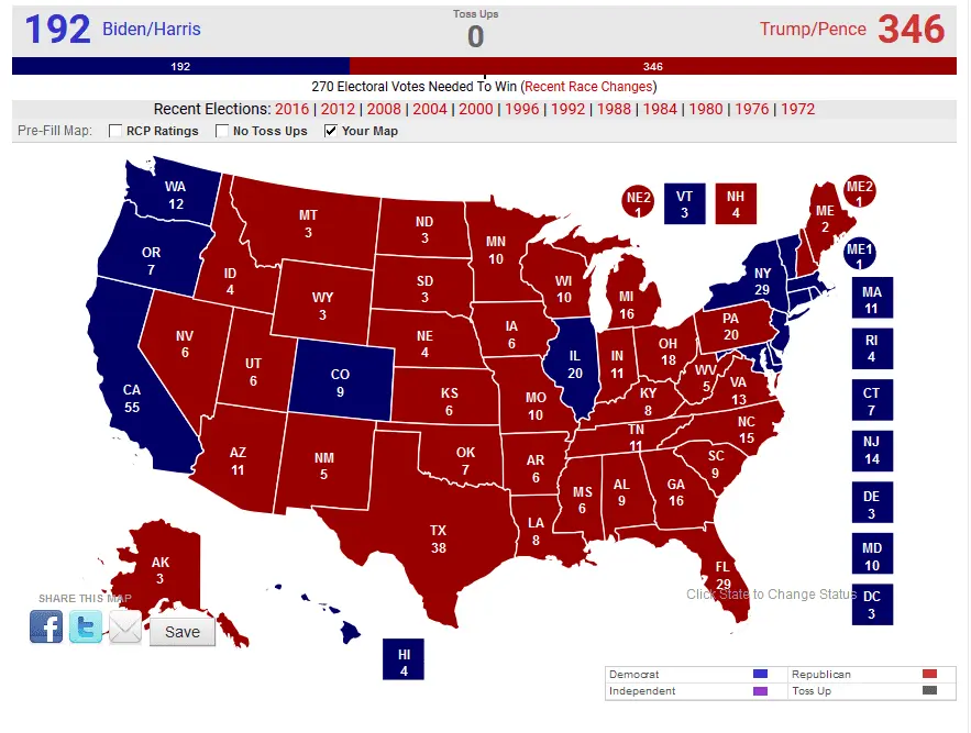Make your map...doesn't necessarily need to be from 270towin.com but needs to contain states blue or red plus split congressional districts...and electoral totals for each candidate.