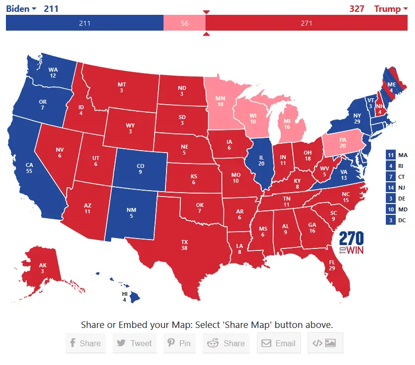 Make your map...doesn't necessarily need to be from 270towin.com but needs to contain states blue or red plus split congressional districts...and electoral totals for each candidate.