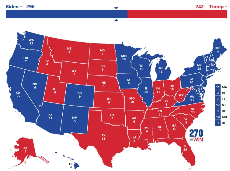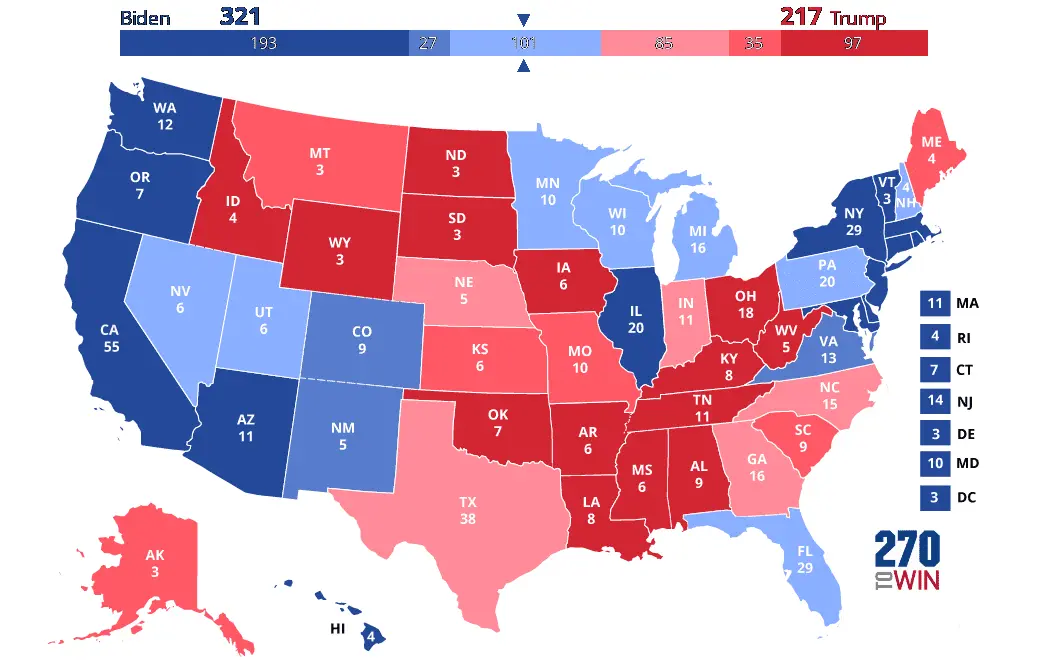 I go 291 for Biden. Ariz Wis Mich and Pa for Biden. And the rest as for 2016. I'm a bit depressed in that I don't think that flips the senate. But I hope, and actually pray in this instance, and I haven't prayed about politics since Vietnam.Who can come closests to the actual results.