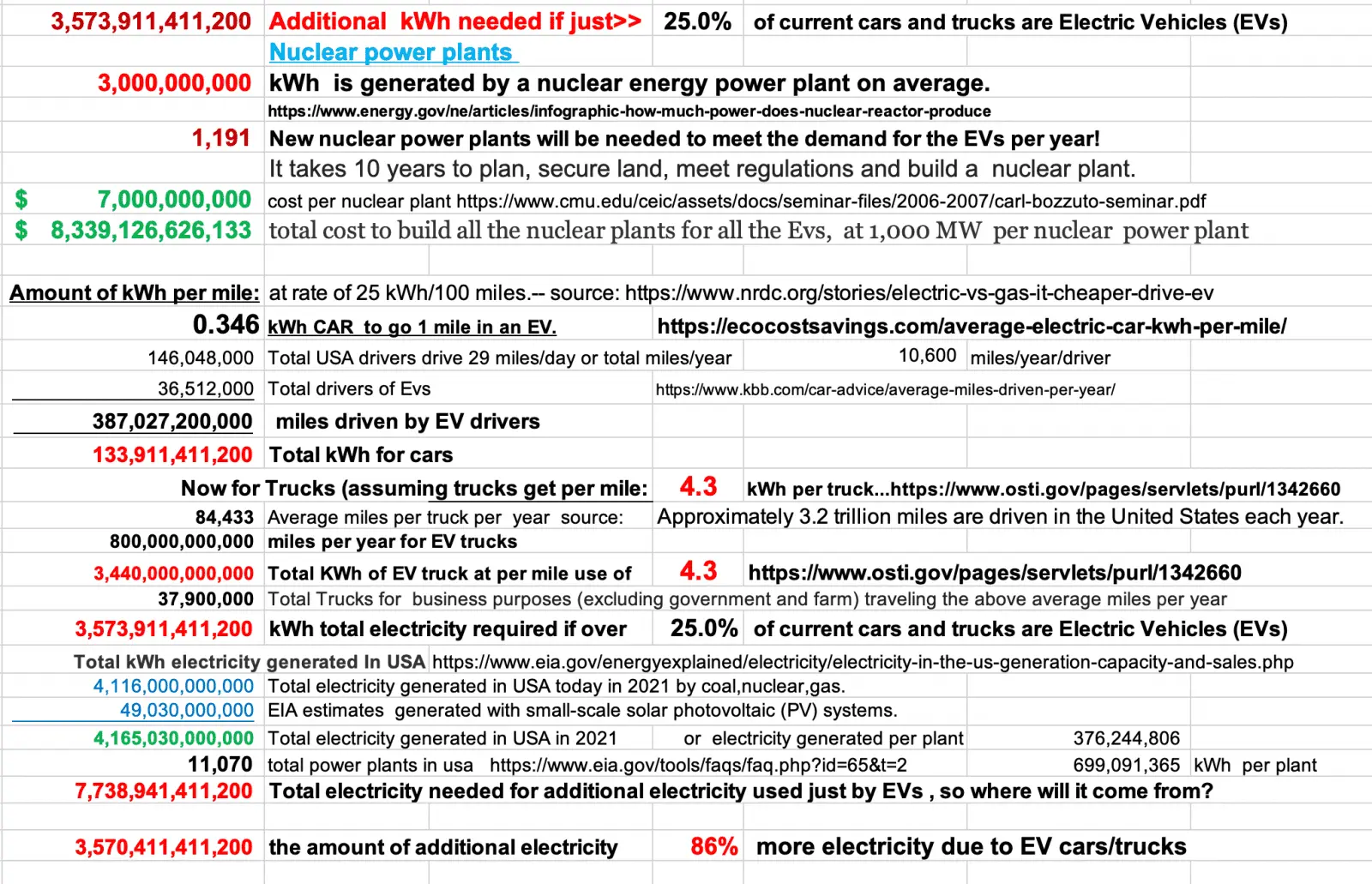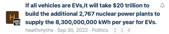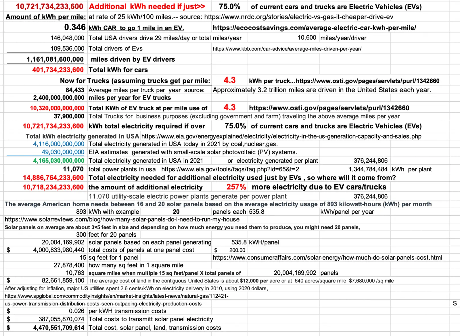 ...In my example of the 19 gigawatts needed just to recharge the 1.9% of EV vehicles in California it would take a solar farm the size of a West Texas county and then it would only work when the sun was out.