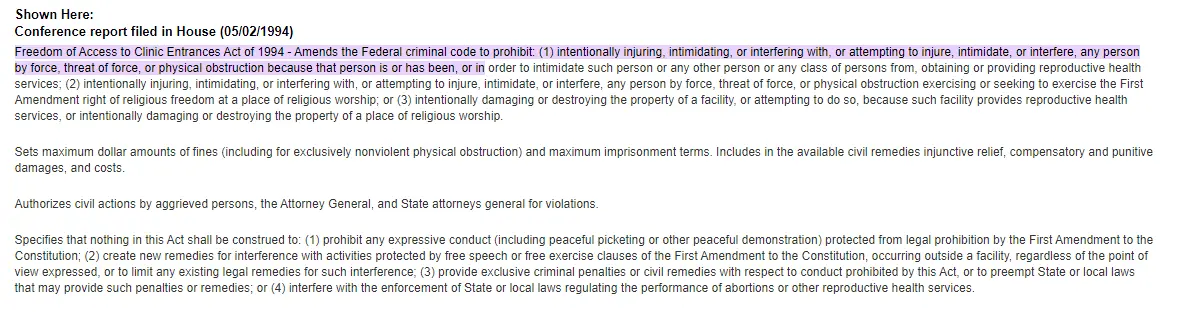 The obvious answer was yes, what else could it be for? The clear intent of this bill was to provide a way to get around the double jeopardy laws, if an abortion protester were found not guilty of a violent crime outside of an abortion clinic, or to prosecute someone - specifically an abortion protester - that local jurisdictions did not.