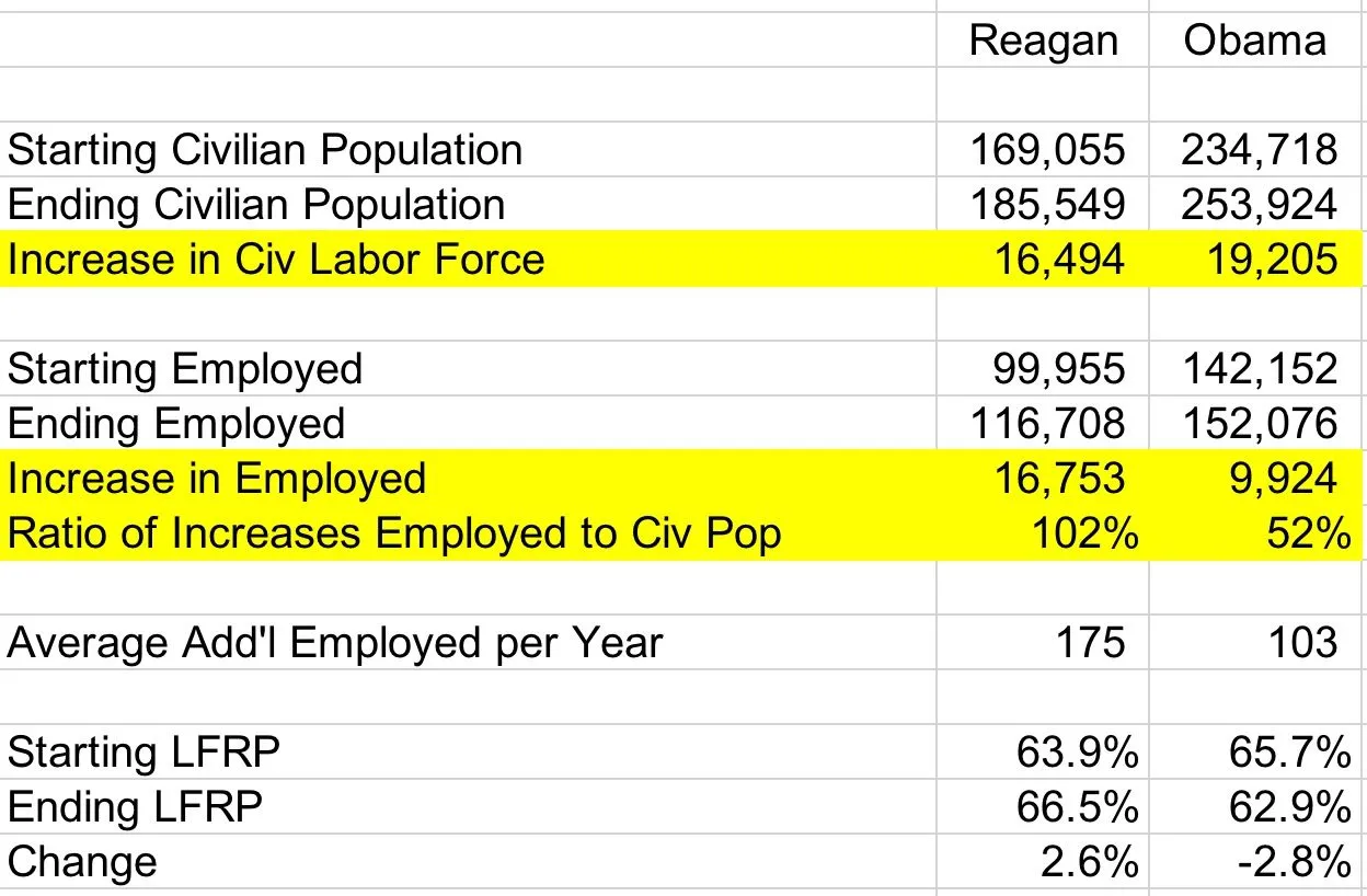 I've posted the analysis in the past. Obama's lack of a real recovery cost the economy MILLIONS of jobs. Take a look at Reagan's job creation vs. Obabble's . The latter's is atrocious considering the tee up after a recession. Trump is early in his terms, with the tax burden and regulatory changes just starting to have an impact.