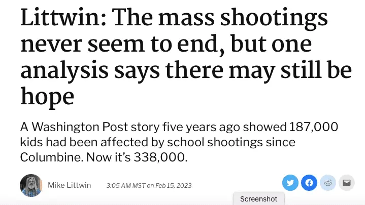 WAPO is behind a paywall. The OP/ED cites the WAPO story. 338,000 +/- students have been in a school that suffered a school shooting. The reporter cited that five years earlier when he did the research, it was 187,000.