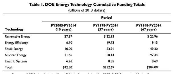 Over the 37-year period from the Department of Energy’s (DOE’s) inception at the beginning of fiscal year (FY) 1978 through FY2014, federal funding for renewable energy R&D amounted to about 17% of the energy R&D total, compared with 15% for energy efficiency, 26% for fossil, and 38% for nuclear. For the 67-year period from 1948 through 2014, nearly 12% went to renewables, compared with 10% for efficiency, 25% for fossil, and 49% for nuclear.