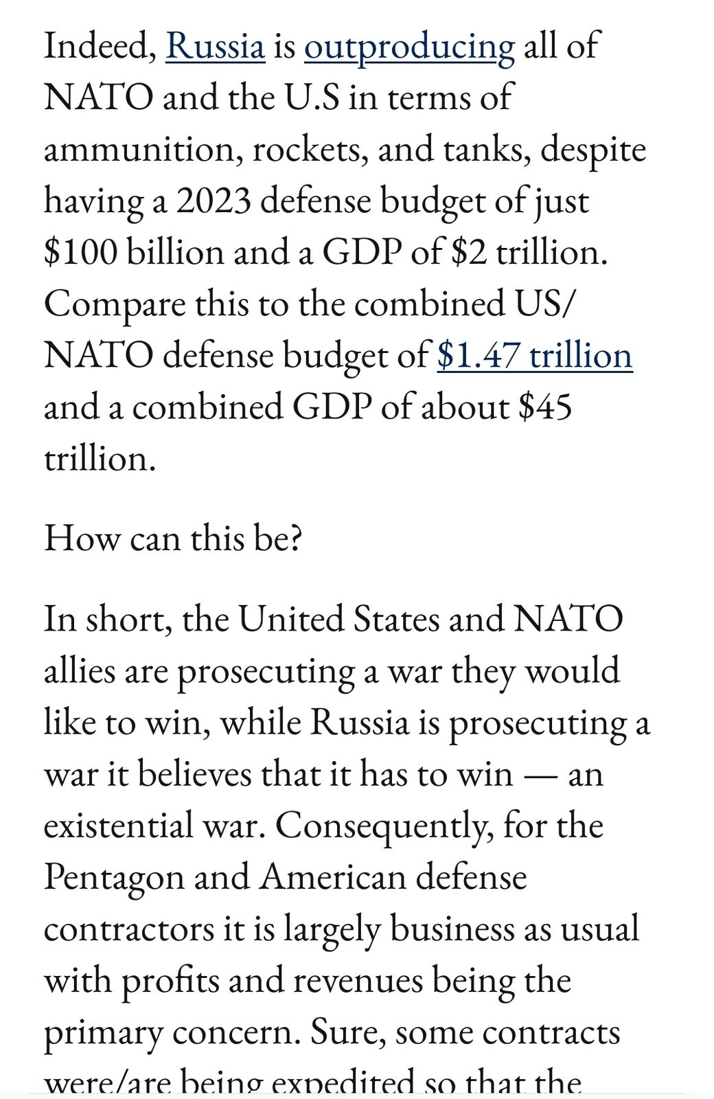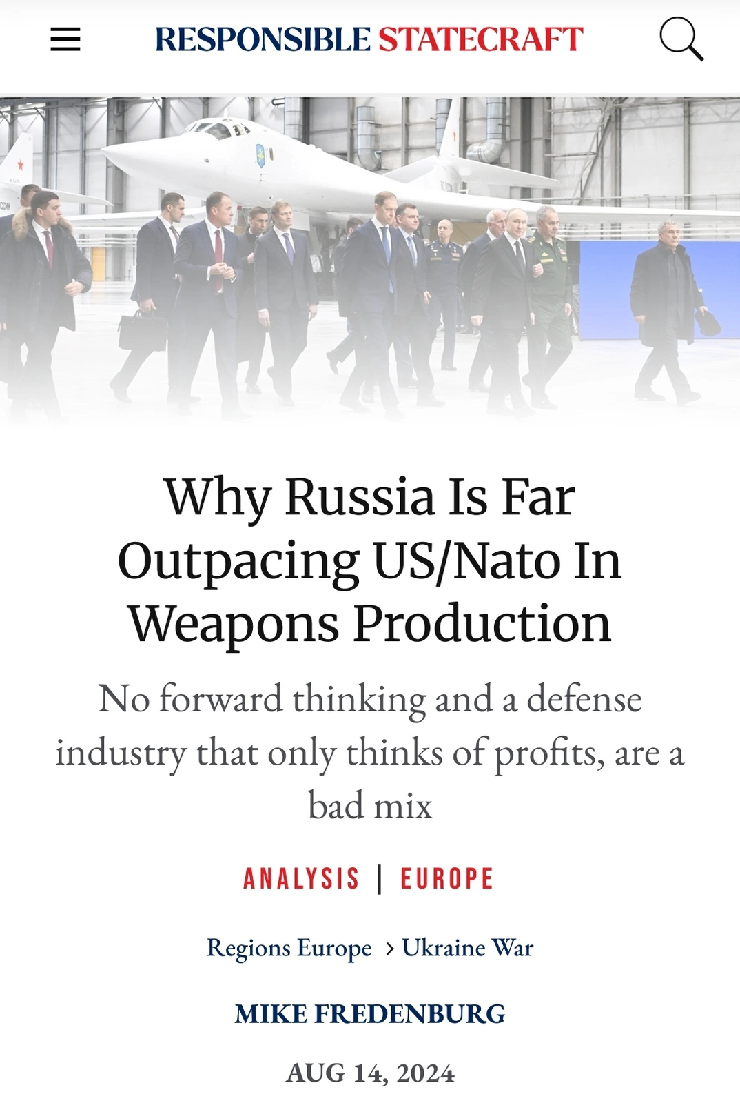 It's very simple. The fact, now undeniable even by the most wishful-thinking western experts, is that Russia far outpacing not only the USA, but all NATO-countries combined in the terms of military production.
