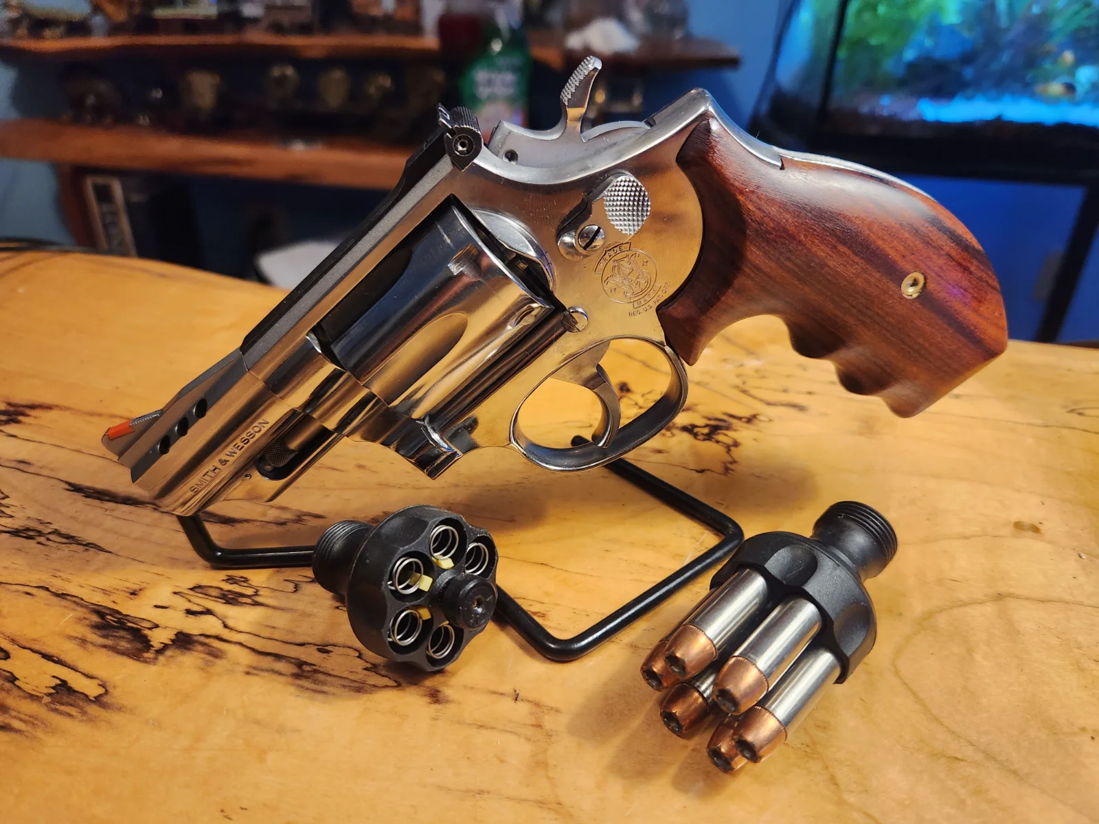 I also have a .357/.38 Special which is a six shot revolver, but with a 6 1/4" barrel is a large frame and I need either a shoulder or side of leg holster. It is a joy to shoot despite size and weight of the pistol itself. This is the one I keep "under the bed" for home defense(intruder) use. First couple rounds are frangible.
