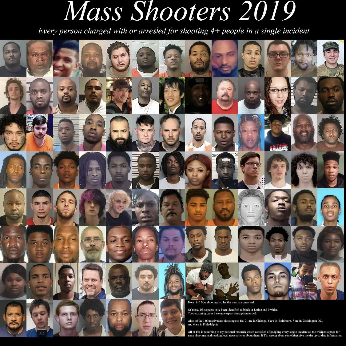 Looking at the data from the Mass Shooting Tracker, widely utilized by the media, as of this writing, of the 72 mass shooters, perpetrators in shootings that killed or wounded 4 or more people, whose race is known, 21 were white, 37 were black, 8 were Latino, and 6 were members of other groups.
