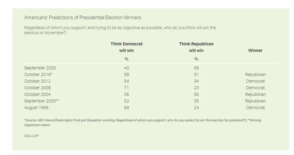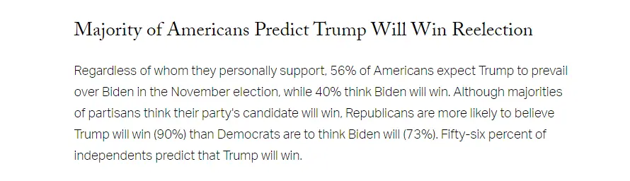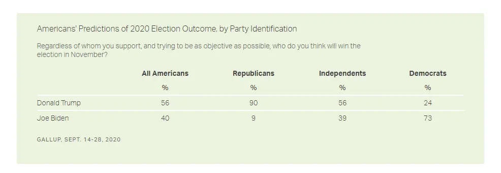 It's the All Americans Poll result you need to pay attention to below, ignore the Republicans and Democrats (but is IS interesting that only 9% of Republicans think that Joe Biden will win compared to the pretty larger figure of 24% of Democrats think that Donald Trump will win)