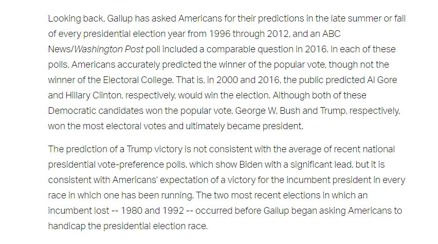 The Gallup Polling is always very interesting, not on who is voting for who but on WHO they think will WIN the Election. Gallup has done these Polls since 1996 and up to 2012 and every Poll has been accurate except the Poll they did for the 2000 Election which was inaccurate as they for some reason did it only on Registered Voters, they did not do a 2016 Poll it was done by ABC/Washington Post and they got the result wrong.