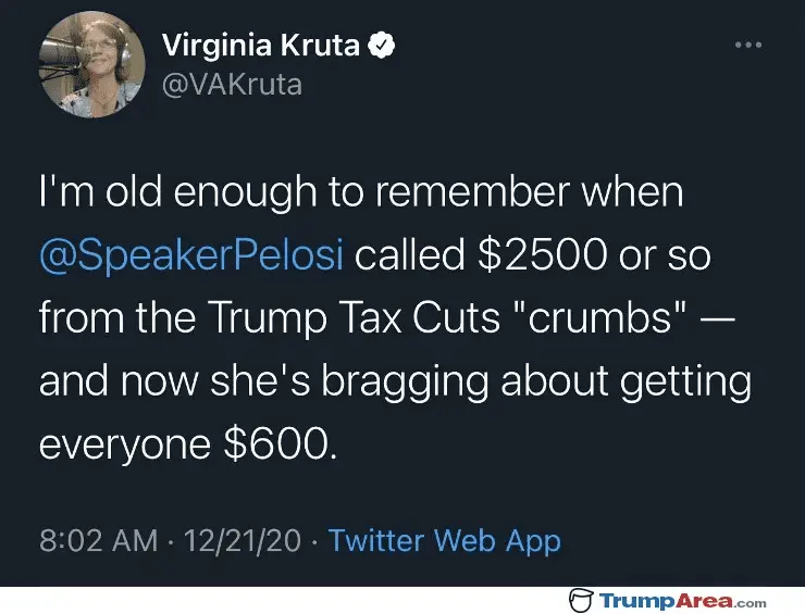Don't you love they way Pelosi described the $600.00 as "significant" but derided the $1,000.00 bonuses some employees received from their employer as a result of the Tax Cuts and Jobs Act passed in 2018 as "crumbs?"