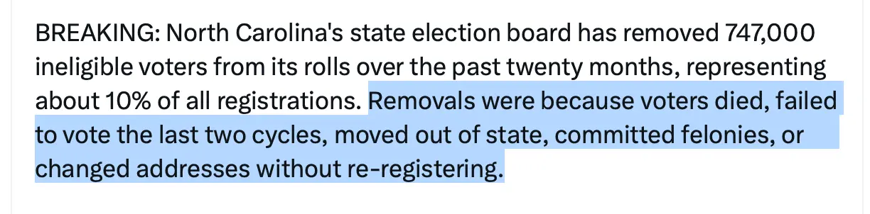 North Carolina removed more than 700,000 ineligible voters from its list of registered voters just w