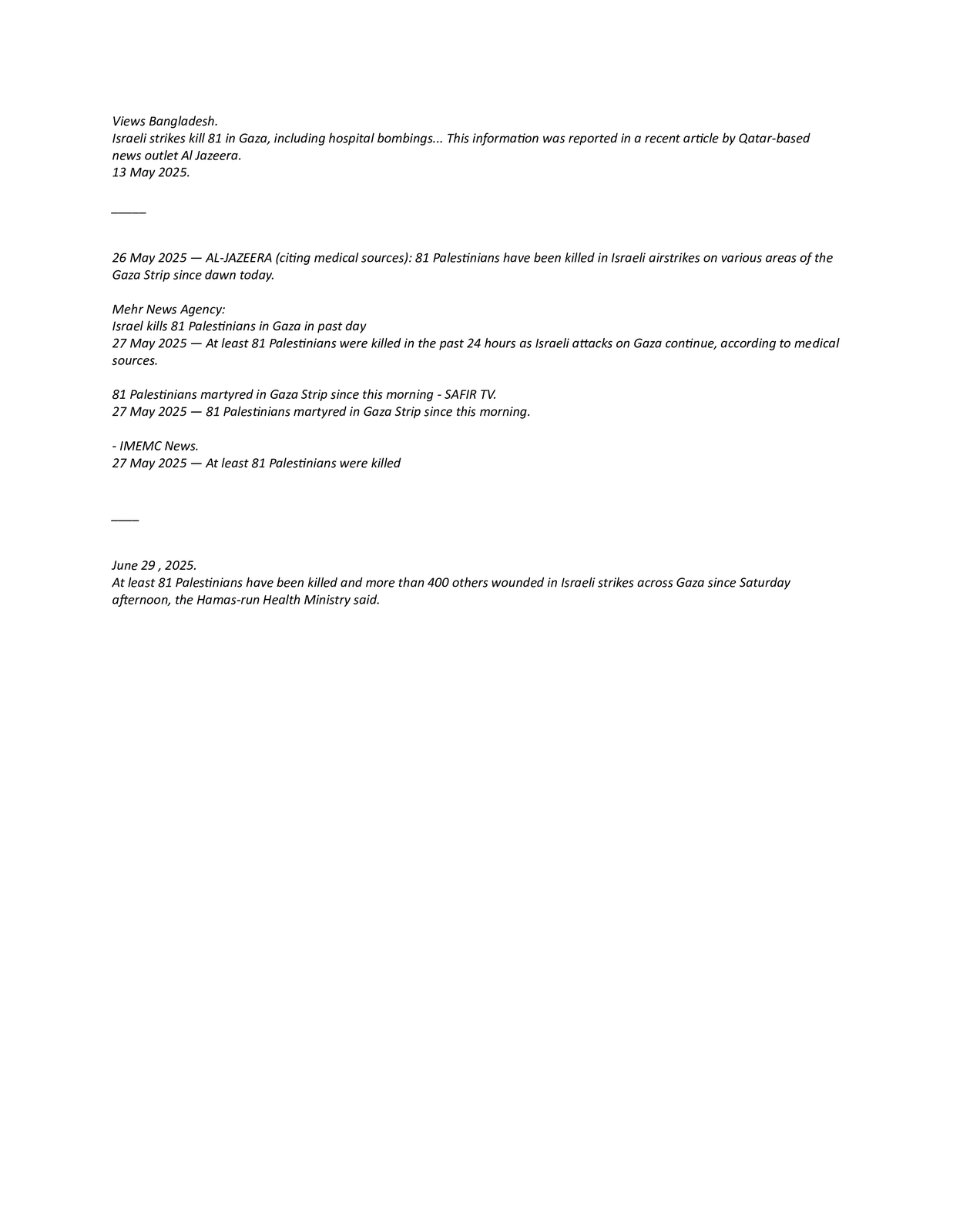 “At least 81 Palestinians have been killed” in 24 hours in Gaza, the BBC reported on June 28, 2025, citing the “the Hamas-run health ministry”.