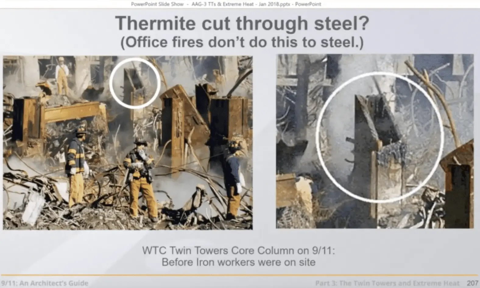 There were reports of molten steel over 3 months after into December and January......Even when they burn from top to bottom. Aviation fuel has the same burn as kerosene' Concrete melts at 3,600 to 4,200 degrees . in building 6 there was an armory. All that was left was the concrete that formed around them. 2 months after they were still running into flowing red hot steel and there is only two thing that burn without oxygen, white phosphorus and thermite.