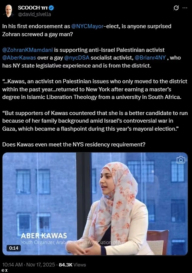 Aber Kawas, a Palestinian-American activist who only moved to the district last year, has received Mamdani's backing in her fight to take his seat in the state's 36th district in a special election, The New York Daily News reported.