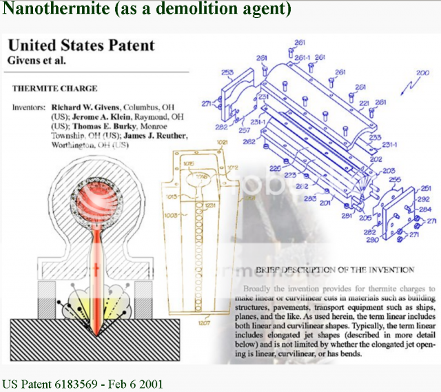 Nothing personal, but your words carry no weight. Saying people knew they existed, I just can't prove it, proves it as much as claiming your dad knew there were aliens in area 51.Patents don't prove anything. There are many patents which were never developed. Try showing evidence that such a device actually existed prior to 9.11 and worked as designed.US4216721.pdf describes a "thermite penetration device" that was patented on August 12, 1980 (after having been filed for in 1972).