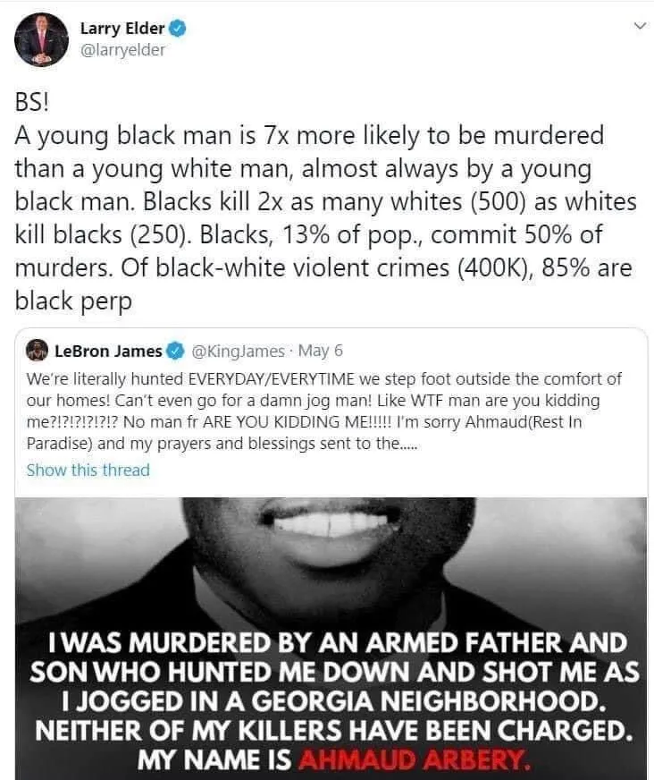 Every year the Uniform Crime Reports from American law enforcement agencies show that whites commit over 60 percent of all violent crime. In the history of this country white men have committed far more acts of violence than all others combined. So as usual that fool has repeated a racist lie and as we see, white men believing this lie feel empowered to take the law in their own hands. And they add to the total of white male violence in America. White men are 31 percent of the population and annually they make up 70 percent of all crime. Annually , that means every year.Because black men are 6% of our country but make up 55% of all violent crimes.. does it take a ******* genius to understand black men are ******* violent?That might haveA black man jogging in an affluent suburban Georgia neighborhood was shot dead by neighbors on February 23, who thought he was a robber, setting off online protests labeling the incident as racial profiling, The New York Times reported.