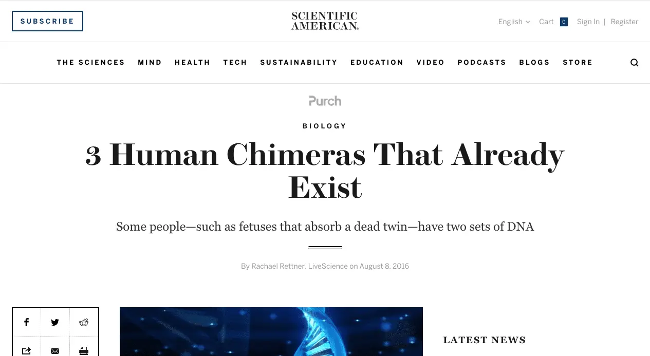 One way that chimeras can happen naturally in humans is that a fetus can absorb its twin. This can occur with fraternal twins, if one embryo dies very early in pregnancy, and some of its cells are "absorbed" by the other twin. The remaining fetus will have two sets of cells, its own original set, plus the one from its twin. [
