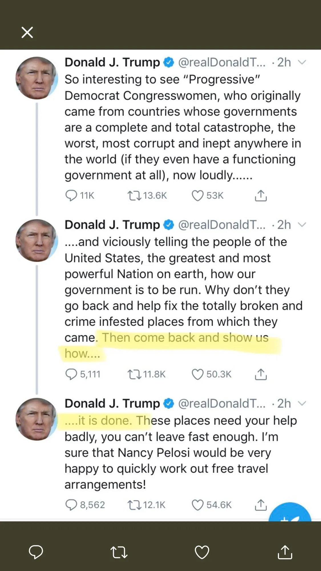 "talks about sending 3 congresswoman of color “back to where they came from”"