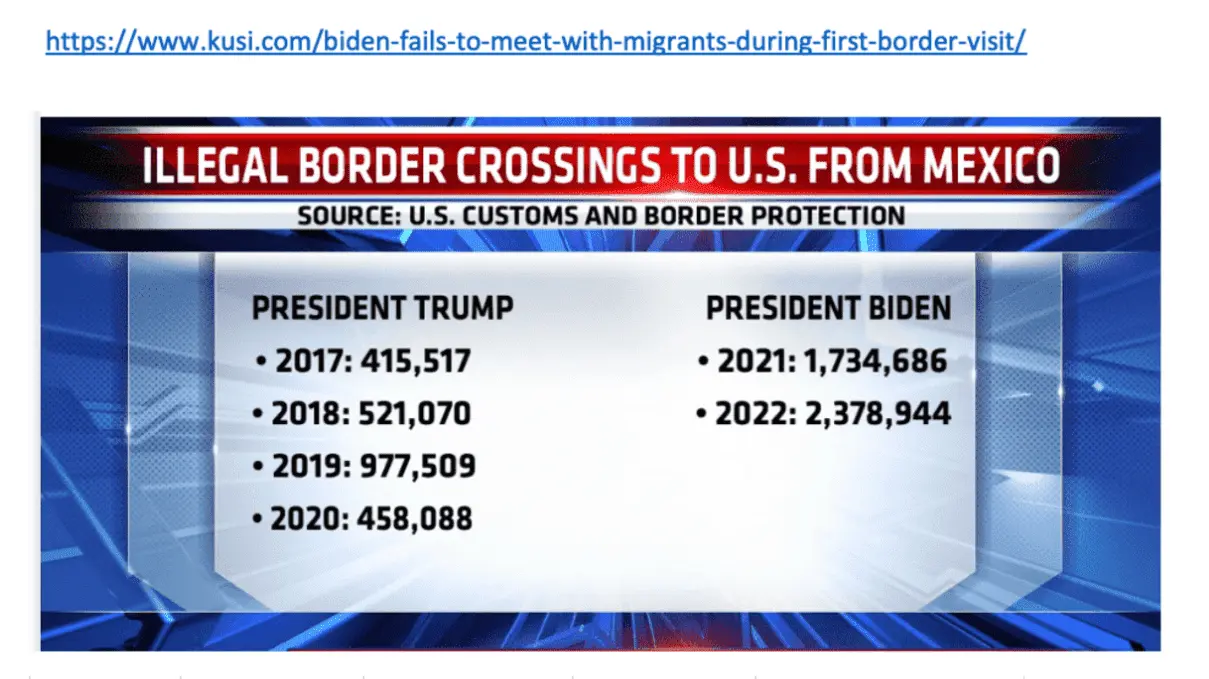 Had COVID not slowed illegal immigration and it had keeping the same rate of growth as Trump's first 3 years, 2020 would have seen 1,504,638 crossings, which is pretty close to what we saw in 2021. Keeping the same rate of growth that Trump had his first 3 years 2023 would have seen 3,127,415 crossings...again pretty close to what we got.