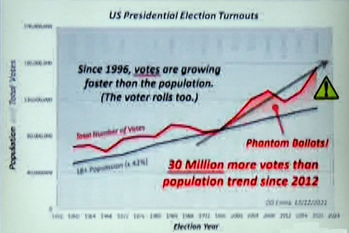 What the guy noticed here is that starting about 20 years ago around the time computers started being used to tabulate votes, that despite the trend in population growth, the number of actual votes being recorded nationwide started outpacing the population increase by about 10%! OK, so one can probably rationalize these discrepancies and dismiss them as other things than fraud, right?