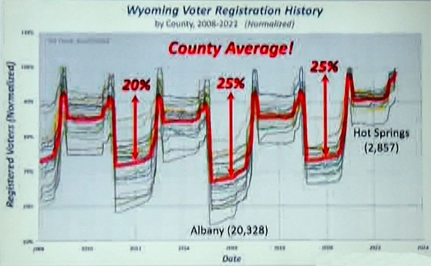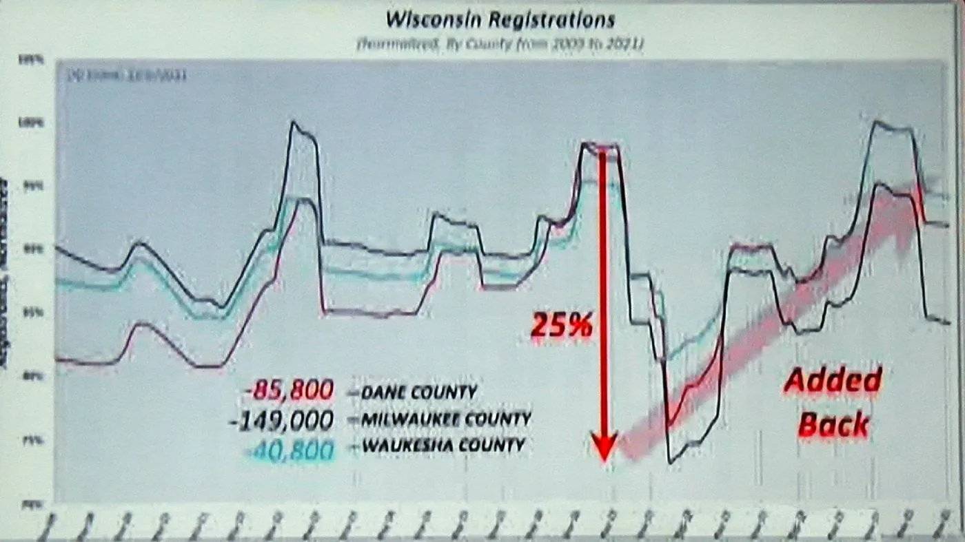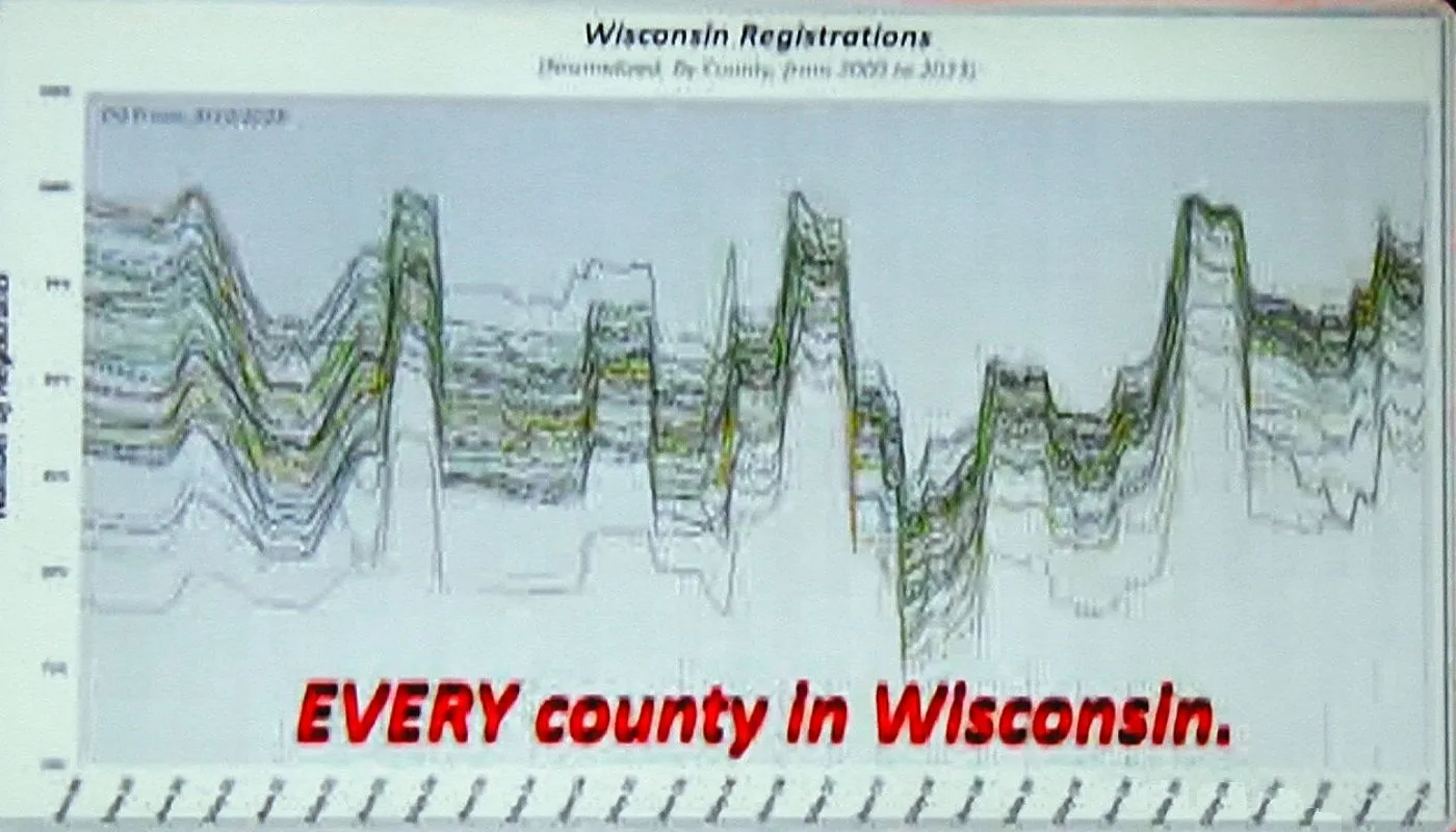 So, the expert tabulated the registration trends for ALL of the counties in Wisconsin and found that they ALL followed the same trends! A statistical IMPOSSIBILITY. Even if there was some sort of mass exodus of old voters and new voters coming in in one place, it would be impossible to explain how the same trends and timing was happening in every county!