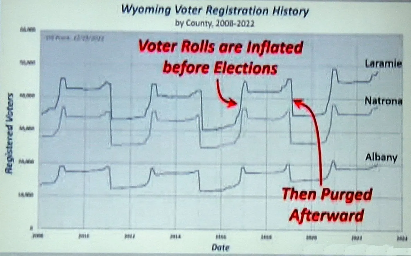 Taking the state of Wisconsin as an example and tabulating voter registrations for the three biggest counties, he found that there were huge swings in voter registration that coincided with elections, by as much as 25%! Voter registrations would zoom UP right before the election was to happen, then after it was over, they would fall precipitously again! By 25%! Then they would get added right back for the next election! Even more statistically bizarre, despite each county being separate, with differing populations and demographics, THE SAME TRENDS TRACKED EVERYWHERE ACROSS THE STATE; another statistically unresolvable anomaly.