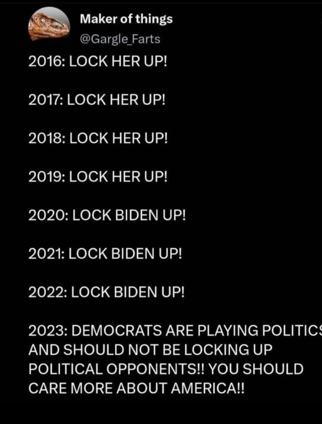 Yes, we have a 2-tier justice system and the Conservatives want to keep it that way...that 2-tier justice system is what protects those with wealth and power....Did the world end when Trump's business was convicted on all counts? Did the world end when Trump's own CFO was sentenced to federal prison? He is about to get out next month, it's not that serious, so relax....don't go behave like that buck dancing clown in the videos posted above -- folks like him are just grifters...they will find someone else to leech onto once Trump is no longer the anointed one.