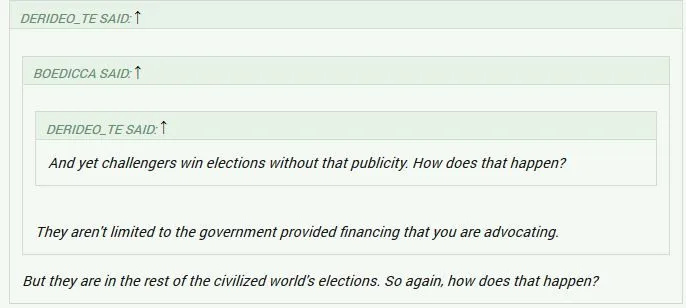 You can't because I didn't so I will spare you the embarrassment of having to admit that you indulged in hyperbole and just provide you with two links. Yes, they show that some nations don't have campaign limits but they do have other restrictions that negate the impact of unlimited campaign spending. Try and figure out how that works from the links provided before you respond and save us both the time of doing that silly dance. Thank you.