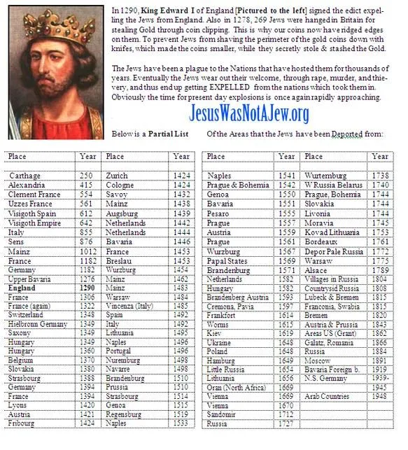 Look, moron, it is irrelevant who made the meme. The expulsions are real. They occurred everywhere Jews went throughout history. It happened over 100 times prior to Hitler. The reasons for these expulsions are clear and the world faces these same obstacles today.Brought to us by "Jesus was not a Jew.org"? Seriously, Achmed, you need to get a life.It certainly was not just the nazis. This has been our plight throughout history.Isn't that what the Nazis said? "Why don't you Jews leave our country and go to your homeland over there?"