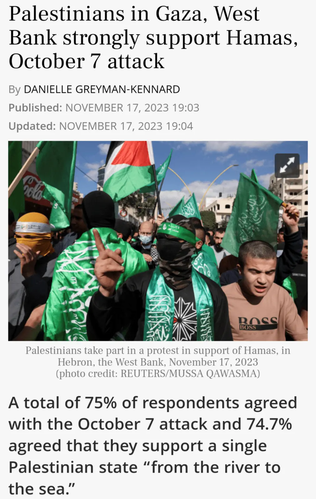 Were the polls taken before or after the death toll in Gaza went into the thousands, many of whom were children? Current estimates 14,500 dead civilians, 6,000 of whom were children. Seeing entire families slaughtered tends to change opinions whether it’s the Israeli’s uncovering the extent of Hamas’ atrocities or the Gazan’s unable to escape the relentless bombings.Those not in the 'war zone' (not Gaza, but West Bank) support Hamas' Oct/7 atrocities even more.