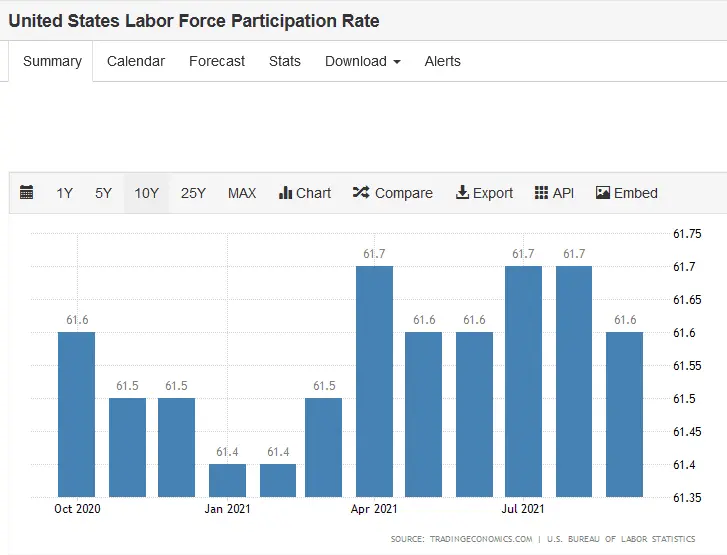 A better metric is the "Participation Rate" which shows those who are employed. September dropped slightly as we would expect with so many leaving their job.