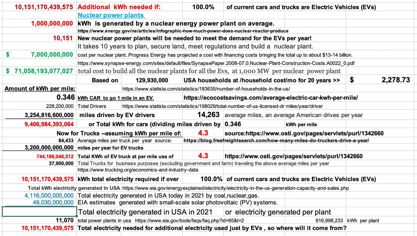 Yea sorry but we do love our oil products. And frankly I don't think we are willing to pay $ $2,278.73 per month for 20 years by everyone of the 129 million households to provide the additional 10 Trillion kWh per year at a cost of to each household JUST to build the 10,151 NEW nuclear plants just to cover the EVs. Please review the attached chart and correct any mistakes. Because even if I'm off by 50% ...that's still over $1,100/mo/ for 20 years JUST to pay the electric companies to build the power plants.