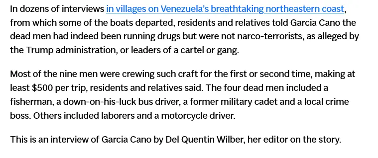 Nope, folks on the ground investigating who they are, have confirmed, the Venezuelan government has nothing to do with these folks desperate actions, other than being responsible for the terrible economic environment they live in that causes them to turn to drug running.It's not American People in those drug running Venezuelan government sponsored boats in international waters.![]()