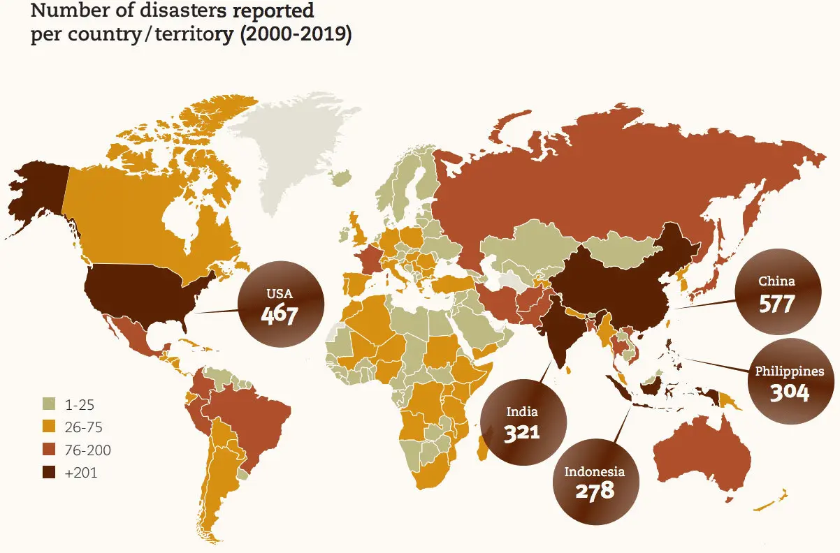 The report, “The Human Cost of Disasters 2000-2019,” found that Asia experienced the highest number of extreme weather events, with 3,068 over the 20-year period. China had the highest number of any single country, suffering from 577 major natural disasters. The United States came in second, with 467 events, followed by India, 321 events, the Philippines, 304, and Indonesia, with 278 disasters.