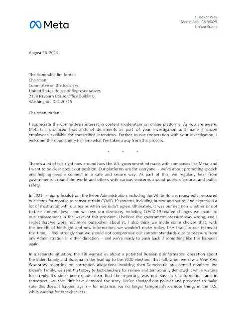 Mark Zuckerberg says he regrets that Meta bowed to Biden administration pressure to censor content, saying in a letter that the interference was “wrong” and he plans to push back if it happens again.