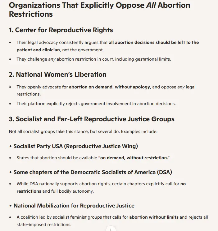 isn't this what I asked for in the beginning :Make a short list of groups that explicitly oppose all abortion restrictions: