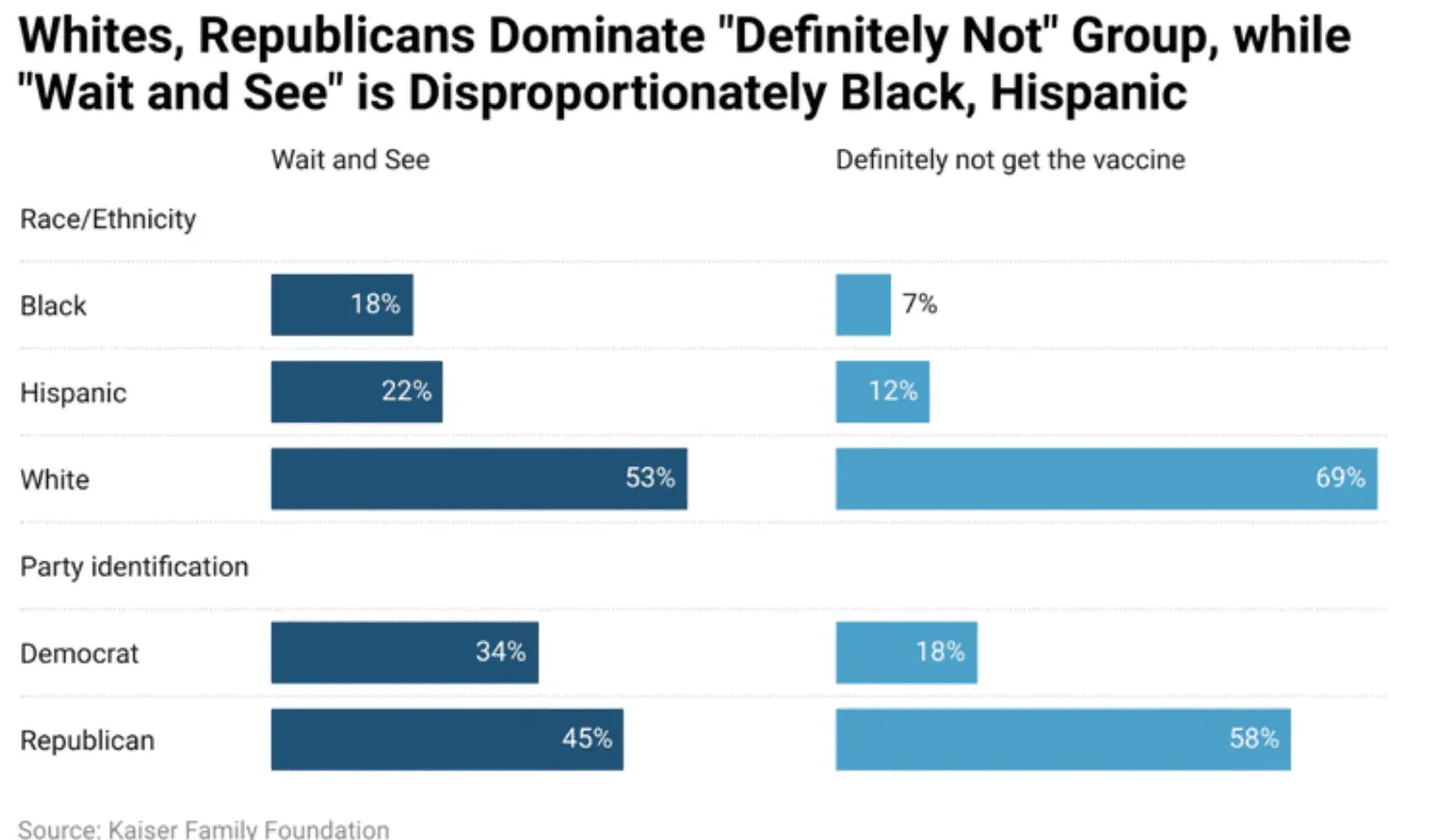 Worse group to get vaccinated are White Republicans ...Lets see here: These liberal wankers that didn't want voter ID because it was racist, NOW suddenly want you to have proof of vaccination even though a large number of BLACKS don't want vaccination. Lets take another tact: vaccinated people can still contract and spread Covid anyway, and Covid19 is 99% survivable. Why all this ruckus over what is basicaly something the Human race has dealt with for thousands of years? Covid IS NOT the black death, why this over reaction?