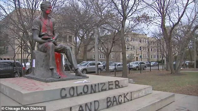 A statue of young Abraham Lincoln has been splashed with red paint with the words 'COLONIZER' and 'LAND BACK' written below it in Chicago.