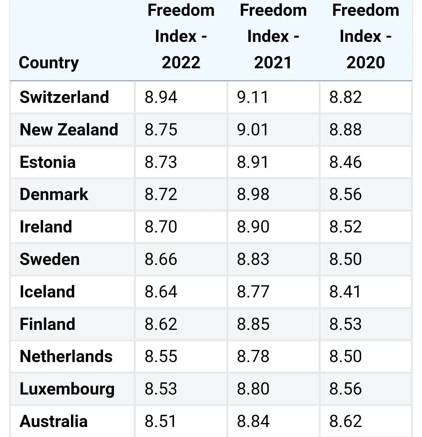 Detailed data on freedom index by country throughout the years, including scores for Human Freedom, Personal Freedom, and Economic Freedom.worldpopulationreview.com
